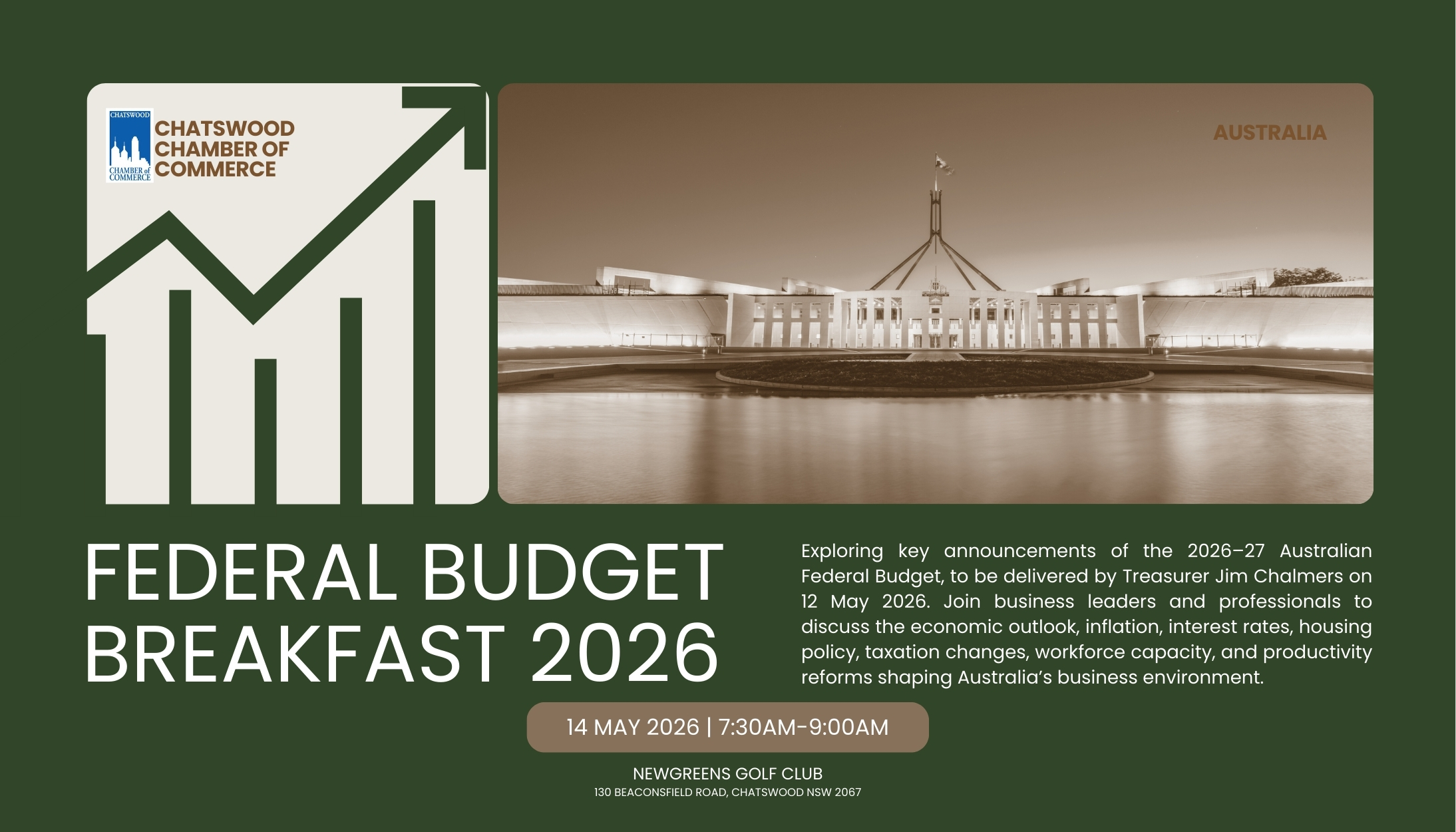 on 12 May 2026. As one of the Chamber’s key annual events, this breakfast provides a timely opportunity for the business community to gain practical insights into how the Federal Budget may shape Australia’s economic outlook and impact businesses locally and nationally.